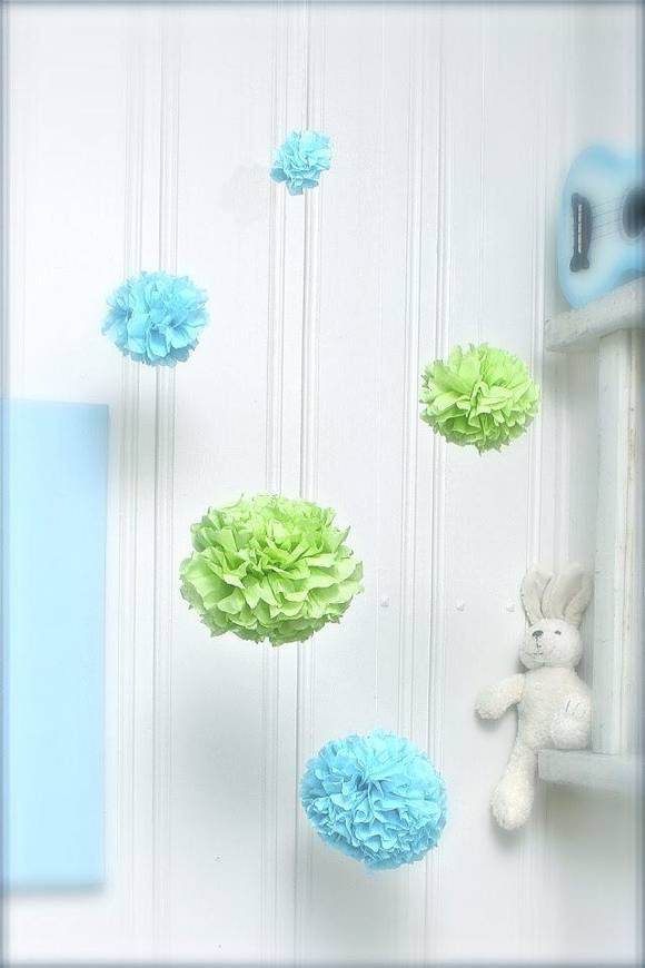 Pom poms av servietter er fine å pynte med til fest, eller de kan henges ute som pynt.